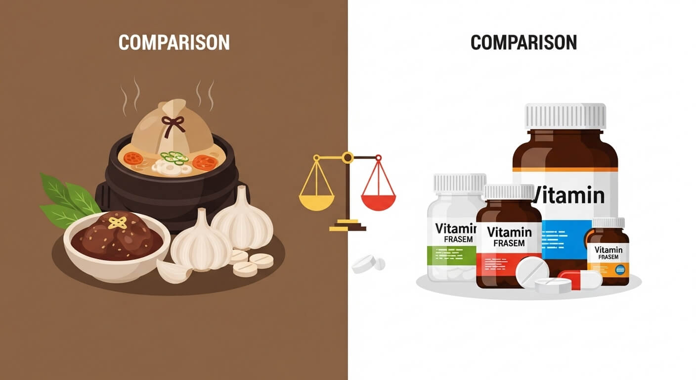 보양식과 비타민은 각각의 특성과 장단점을 지니며, 면역력 강화에 도움이 되는 방식도 다릅니다. 보양식은 자연 식재료를 기반으로 하여 인체 친화적이고, 따뜻한 식사로 체온 유지에 효과적이며 정서적인 안정감까지 제공하는 장점이 있습니다. 가족이 함께 식사하며 건강을 챙길 수 있는 문화적 가치도 큽니다. 반면 비타민은 특정 영양소를 정제된 형태로 제공해 흡수가 빠르고, 부족한 성분을 정확히 보충할 수 있어 과학적이고 효율적인 접근이 가능합니다. 특히 체내 비타민 농도를 측정해 맞춤형으로 섭취할 수 있다는 점은 보양식 대비 명확한 이점입니다. 그러나 보양식은 준비 시간이 오래 걸리고 비용이 들며, 열량 과잉으로 이어질 수 있고, 비타민은 자연식품이 지닌 복합작용을 대체하지 못하는 한계가 있습니다. 또한 비타민은 습관적 과다복용 시 간 기능 저하, 신장 문제를 유발할 수 있습니다. 이 때문에 전문가들은 보양식과 비타민을 상호 보완적으로 활용할 것을 권장합니다. 예를 들어, 아침이나 점심 식사는 보양식을 활용해 따뜻한 식단을 구성하고, 외출이 잦은 날이나 식사 시간 확보가 어려운 경우 비타민제를 병행하는 식입니다. 특히 체질이나 건강 상태에 따라 섭취 방법을 달리하고, 계절성 변화에 맞춘 맞춤형 식단 및 영양 보충이 필요합니다. 보양식은 ‘음식이 곧 약’이라는 철학을 바탕으로 하여 전체적인 몸 상태를 조절하는 접근 방식이며, 비타민은 특정 영양소를 집중적으로 보완하는 방식입니다. 보양식은 다양한 재료를 사용하기 때문에 복합적인 영양 섭취가 가능하고, 식사라는 일상 속 루틴에 자연스럽게 녹여낼 수 있다는 장점이 있습니다. 반면, 비타민은 정량화된 섭취가 가능하여 과학적으로 필요량을 조절할 수 있다는 강점을 지니며, 바쁜 현대인에게는 시간과 공간의 제약 없이 빠르게 영양을 공급할 수 있는 효율적인 수단입니다. 실천법 측면에서는, 보양식을 주 1~2회 특별한 식사로 구성하고, 평소에는 소량의 비타민 보충제를 활용하는 것이 균형 잡힌 전략이 될 수 있습니다. 또한, 면역력 강화는 영양뿐만 아니라 수면, 운동, 스트레스 관리 등 종합적인 생활 습관의 개선과 함께 이루어져야 하며, 음식과 보조제를 넘는 전체적인 건강 루틴의 정비가 결국 면역 체계를 강화하는 핵심입니다.