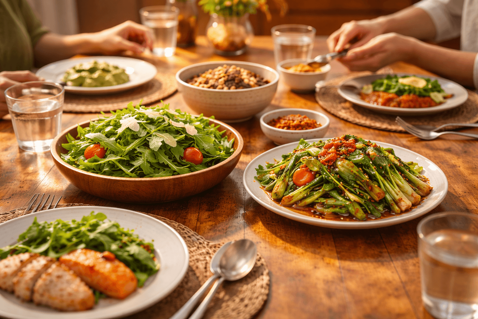 저속노화 식단의 핵심은 염증을 줄이고 세포 산화를 늦추는 식재료를 꾸준히 섭취하는 것입니다. 루꼴라는 지중해 식단의 대표 채소로, 글루코시놀레이트와 폴리페놀 성분이 풍부합니다. 이 성분들은 체내 염증 반응을 낮추고 세포 손상을 완화하는 데 기여하는 것으로 알려져 있습니다. 특히 루꼴라 특유의 쌉싸름한 맛은 이러한 항산화 화합물에서 비롯되며, 혈관 내 산화 스트레스를 줄이는 데 긍정적인 영향을 줍니다. 열무 역시 십자화과 채소로 베타카로틴과 비타민 C가 풍부합니다. 한국 식단에서 열무김치 형태로 자주 섭취되는데, 발효 과정을 거치면 유산균이 생성되어 장내 환경 개선에 도움을 줍니다. 장 건강은 면역력과 직결되며, 이는 노화 속도와도 밀접한 관련이 있습니다. 특히 장내 미생물 균형이 잘 유지되면 염증 수치가 낮아지고 대사 기능이 안정됩니다. 저속노화 측면에서 보면 루꼴라는 생으로 섭취할 때 항산화 성분 손실이 적다는 장점이 있고, 열무는 발효를 통해 기능성이 확장된다는 차이가 있습니다. 즉, 루꼴라는 ‘즉각적인 항산화 식재료’, 열무는 ‘장기적 장건강 기반 노화관리 식재료’로 볼 수 있습니다. 두 채소 모두 노화 억제에 도움이 되지만 접근 방식이 다르다는 점이 핵심입니다. 최근 2026년 건강 트렌드에서 강조되는 저속노화 전략은 단순히 항산화 식품을 섭취하는 것을 넘어, 혈당 안정성과 만성 염증 관리까지 포함하는 통합적 접근을 의미합니다. 루꼴라는 혈당지수가 매우 낮고 식이섬유가 풍부해 식후 혈당 상승을 완만하게 만드는 데 도움을 줍니다. 혈당의 급격한 변동은 체내 당화 반응을 촉진해 피부 노화와 혈관 손상을 유발할 수 있는데, 루꼴라는 이러한 위험을 완화하는 식재료로 평가됩니다. 또한 루꼴라에 포함된 질산염 성분은 체내에서 산화질소로 전환되어 혈관 확장을 돕고 혈류 개선에 긍정적인 영향을 줍니다. 이는 심혈관 노화 속도를 늦추는 데 중요한 요소입니다. 열무 역시 저속노화 식단에서 간과할 수 없는 채소입니다. 특히 열무의 풍부한 식이섬유는 장내 유익균의 먹이가 되어 단쇄지방산 생성을 촉진합니다. 단쇄지방산은 장 점막을 보호하고 전신 염증을 낮추는 데 중요한 역할을 합니다. 최근 장-뇌 축 이론이 주목받으면서 장 건강이 정신적 노화와도 연결된다는 연구 결과가 늘어나고 있습니다. 열무를 꾸준히 섭취하면 장 환경 개선을 통해 면역 균형이 유지되고, 이는 결과적으로 노화 속도를 늦추는 기반이 됩니다. 즉, 루꼴라는 혈관 중심의 저속노화 전략에, 열무는 장 건강 중심의 저속노화 전략에 더 강점을 가진다고 정리할 수 있습니다.