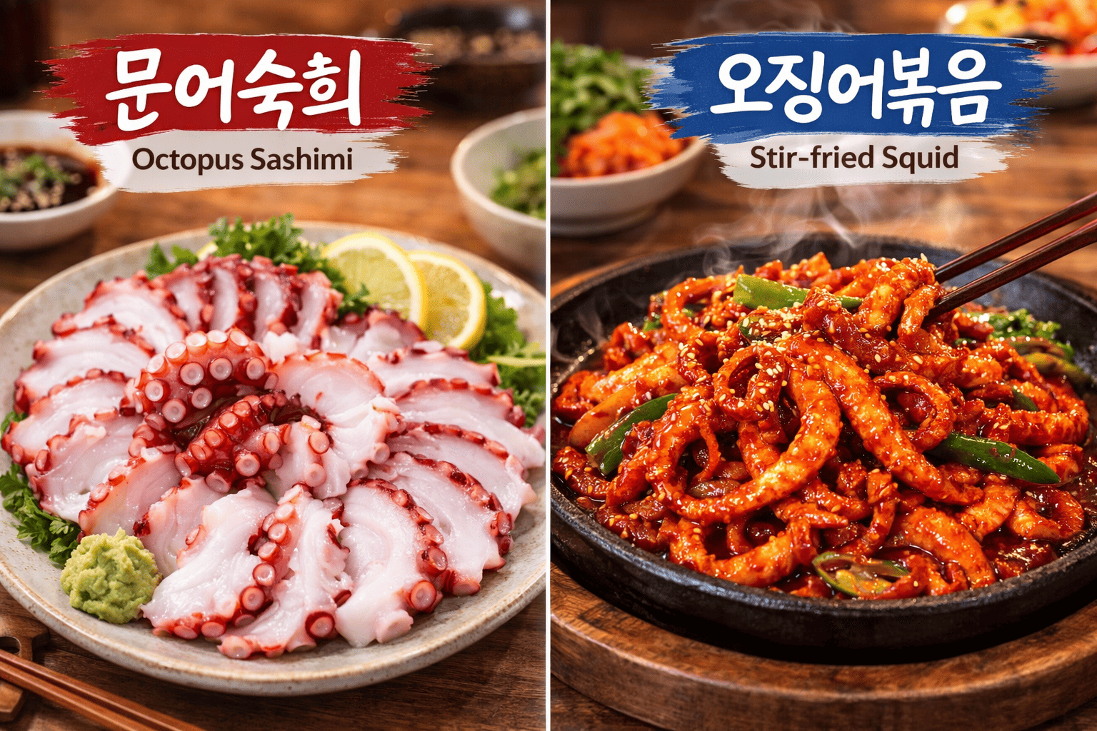 문어와 오징어는 한국 식문화에서 매우 친숙한 대표적인 해산물입니다. 두 생물 모두 바다에서 서식하는 두족류에 속하며 독특한 식감과 풍부한 영양을 가지고 있어 다양한 요리에 활용됩니다. 특히 단백질과 타우린이 풍부한 식품으로 알려져 있어 건강 식단이나 보양식 재료로도 자주 사용됩니다. 하지만 많은 사람들이 문어와 오징어를 비슷한 해산물로 생각하는 경우가 많습니다. 실제로는 생물학적 특징, 영양 성분, 식감, 요리 활용 방식 등에서 여러 차이가 존재합니다. 문어는 여덟 개의 다리를 가진 연체동물로 강한 흡반과 뛰어난 지능을 가진 해양 생물로 알려져 있습니다. 반면 오징어는 열 개의 다리를 가진 두족류로 빠른 유영 능력을 가지고 있으며 몸통이 길고 유선형 구조를 가지고 있습니다. 이러한 구조적 차이는 두 생물의 생활 방식과 요리 활용에도 영향을 줍니다. 최근 건강한 식단에 대한 관심이 높아지면서 문어와 오징어의 영양 가치와 건강 효능에도 많은 관심이 집중되고 있습니다. 이번 글에서는 문어와 오징어의 특징, 영양 성분, 그리고 건강 효능을 중심으로 두 해산물의 차이와 장점을 자세히 알아보겠습니다.