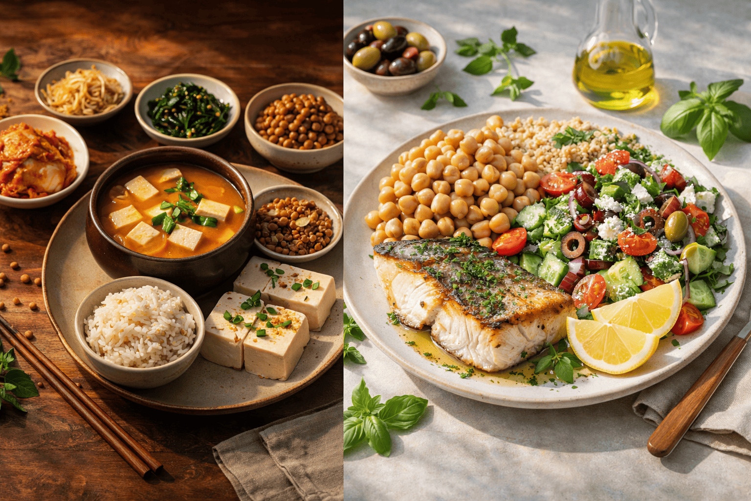 한국 식단과 지중해 식단은 모두 건강에 긍정적인 영향을 주지만, 접근 방식에는 차이가 있다. 한국 식단은 발효 식품과 다양한 반찬 구성을 통해 영양 균형을 맞추는 반면, 지중해 식단은 신선한 재료와 단순 조리 방식으로 영양 밀도를 높인다. 대두 중심의 한국 식단은 단백질 품질이 높고 발효 과정에서 얻는 추가적인 건강 효과가 강점이며, 병아리콩 중심의 지중해 식단은 식이섬유와 항산화 성분이 풍부하다는 장점이 있다. 체중 관리나 혈당 조절이 목표라면 병아리콩이 포함된 지중해 식단이 더 적합할 수 있으며, 근육 유지나 고단백 식단이 필요한 경우에는 대두 중심의 한국 식단이 유리하다. 또한 장 건강을 고려할 때는 발효 식품이 포함된 한국 식단이 효과적일 수 있으며, 심혈관 건강을 중점적으로 관리하고자 한다면 지중해 식단이 도움이 된다. 최근에는 두 식단의 장점을 결합한 혼합형 식단이 주목받고 있다. 예를 들어 병아리콩 샐러드에 된장 드레싱을 활용하거나, 두부와 올리브오일을 함께 사용하는 방식으로 두 식단의 장점을 동시에 활용할 수 있다. 이러한 융합 식단은 영양 균형을 극대화하면서도 식단의 다양성을 높여준다. 두 식단을 비교할 때 중요한 요소 중 하나는 ‘지속 가능성’과 ‘생활 적합성’이다. 한국 식단은 익숙한 음식으로 구성되어 있어 장기적으로 유지하기 쉽고, 다양한 반찬을 통해 식단의 다양성을 확보할 수 있다. 반면 지중해 식단은 신선한 재료와 간단한 조리 방식이 특징이지만, 일부 재료는 지역에 따라 접근성이 떨어질 수 있다. 따라서 개인의 생활 환경에 따라 식단 선택이 달라질 수 있다. 또한 두 식단은 지방 섭취 방식에서도 차이를 보인다. 한국 식단은 상대적으로 지방 섭취가 낮은 반면, 지중해 식단은 올리브오일과 견과류를 통해 건강한 지방을 적극적으로 섭취한다. 이러한 차이는 에너지 활용 방식과 심혈관 건강에 영향을 미칠 수 있다. 최근에는 두 식단의 장점을 결합하여 보다 균형 잡힌 식단을 구성하려는 시도가 늘어나고 있다. 예를 들어 나물과 병아리콩을 함께 활용하거나, 올리브오일을 활용한 한식 드레싱 등이 그 예이다. 이러한 접근은 전통과 현대, 지역과 문화를 넘나드는 새로운 건강식 트렌드로 자리 잡고 있다.