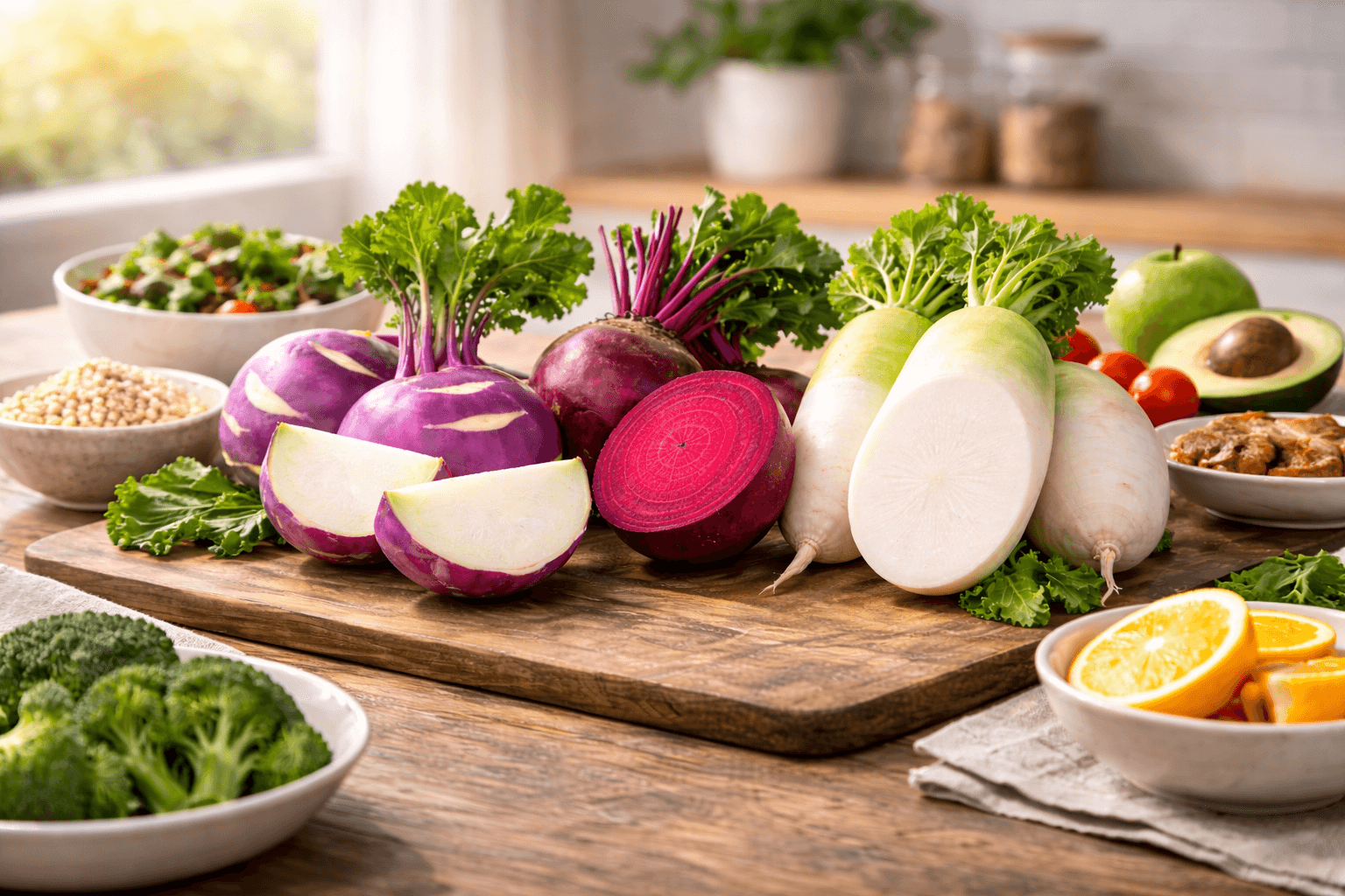 콜라비, 비트, 무는 모두 건강 식단에 유용한 뿌리채소지만, 영양적 초점과 맛의 방향성, 조리 특성이 뚜렷하게 다르다. 항산화 색소와 혈관 건강을 중시한다면 비트, 비타민C와 아삭한 식감을 원한다면 콜라비, 전통 국물과 발효 요리를 중심으로 한다면 무가 적합하다. 세 채소를 목적에 맞게 조합하면 영양 균형과 식탁의 다양성을 동시에 확보할 수 있다. 세 가지 뿌리채소를 비교해보면 각각의 장점이 분명하게 드러난다. 비트는 색감과 항산화 이미지를 중심으로 한 기능성 식단에 어울리고, 콜라비는 비타민C와 아삭한 식감으로 일상적인 건강 관리 식단에 적합하다. 무는 전통 음식과 발효 문화 속에서 오랜 시간 검증된 활용도를 지니며 국물 요리의 깊이를 책임진다. 따라서 어느 하나를 우선순위로 두기보다는 식단 목적, 계절, 조리 방식에 맞춰 선택하는 전략이 중요하다. 예를 들어 생채 위주의 가벼운 한 끼에는 콜라비를, 오븐 요리나 샐러드 플레이팅에는 비트를, 국물 중심의 따뜻한 식사에는 무를 배치하는 식이다. 이처럼 상황에 따라 조합하면 영양 균형은 물론 식감과 색감의 다양성까지 확보할 수 있다. 건강한 식탁은 특정 식품에 의존하는 것이 아니라, 다양한 재료를 목적에 맞게 활용하는 지혜에서 완성된다.