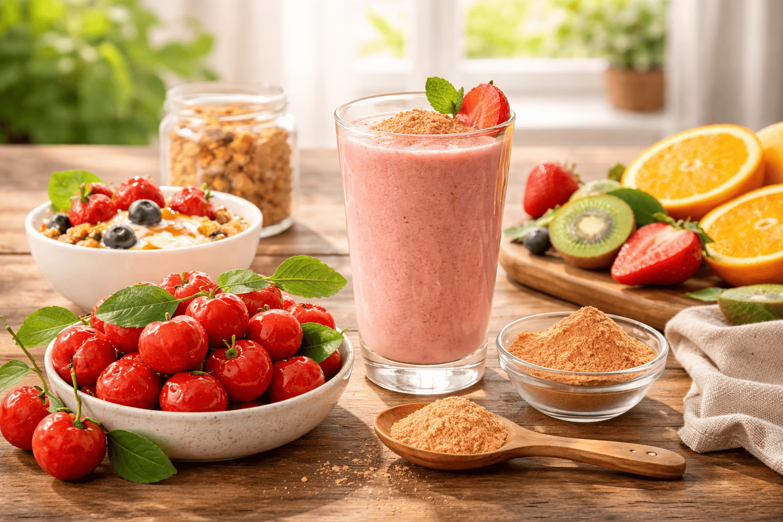 아세로라는 세계적으로 가장 높은 수준의 비타민C 함량을 가진 과일 중 하나로 평가된다. 일반적으로 오렌지나 레몬과 같은 감귤류 과일이 비타민C 공급원으로 잘 알려져 있지만, 아세로라는 같은 무게 기준으로 비교했을 때 감귤류보다 훨씬 높은 비타민C를 함유하고 있다. 일부 연구에 따르면 아세로라 100g에는 수백 밀리그램 이상의 비타민C가 포함되어 있으며, 이는 일일 권장 섭취량을 충분히 충족할 수 있는 수준이다. 이러한 높은 비타민C 함량은 체내에서 다양한 생리적 기능을 지원하는 데 중요한 역할을 한다. 비타민C는 체내에서 스스로 생성되지 않기 때문에 반드시 음식이나 보충제를 통해 섭취해야 하는 필수 영양소이다. 아세로라는 자연 식품 형태로 비타민C를 공급한다는 점에서 영양학적으로 가치가 높다. 특히 비타민C는 콜라겐 합성에 관여하여 피부 건강을 유지하는 데 중요한 역할을 한다. 콜라겐은 피부 탄력과 구조를 유지하는 단백질로, 충분한 비타민C 섭취는 피부 노화를 늦추는 데 도움을 줄 수 있다. 또한 아세로라에는 비타민A, 비타민B군, 미네랄, 폴리페놀과 같은 다양한 식물성 영양소도 포함되어 있다. 이러한 성분들은 서로 상호작용하면서 건강에 긍정적인 영향을 미친다. 특히 천연 식품 형태의 비타민C는 다른 식물성 화합물과 함께 작용하여 체내 흡수율을 높이는 데 도움을 줄 수 있다. 이러한 이유로 아세로라는 단순한 비타민 보충 식품을 넘어 종합적인 영양 공급 과일로 평가되고 있다. 아세로라가 특히 주목받는 이유는 비타민C의 밀도가 매우 높다는 점뿐 아니라 흡수율 측면에서도 장점이 있다는 것이다. 자연 식품에서 섭취하는 비타민C는 플라보노이드와 같은 식물성 화합물과 함께 존재하는 경우가 많으며, 이러한 성분들은 체내에서 비타민의 안정성과 흡수를 돕는 역할을 한다. 아세로라에도 다양한 식물성 화합물이 포함되어 있어 단순한 합성 비타민 보충제와는 다른 영양적 가치를 제공할 수 있다. 또한 아세로라에는 소량이지만 칼륨, 마그네슘, 철분 등 다양한 미네랄도 포함되어 있어 전반적인 영양 균형에 도움을 줄 수 있다. 아세로라는 신선한 과일로 섭취할 수도 있지만, 과일의 특성상 수확 후 신선도를 유지하기 어려운 경우가 많아 분말 형태나 농축 추출물 형태로 가공되어 유통되기도 한다. 이러한 제품들은 스무디, 요거트, 건강 음료 등에 활용되며 간편하게 비타민C를 보충할 수 있는 방법으로 활용된다. 특히 자연 유래 비타민을 선호하는 소비자들에게 아세로라 분말은 꾸준히 인기가 있는 원료로 자리 잡고 있다. 이러한 특징 때문에 아세로라는 건강식품 산업에서도 중요한 원료로 활용되고 있으며 다양한 영양 보충 제품의 핵심 성분으로 사용되고 있다.