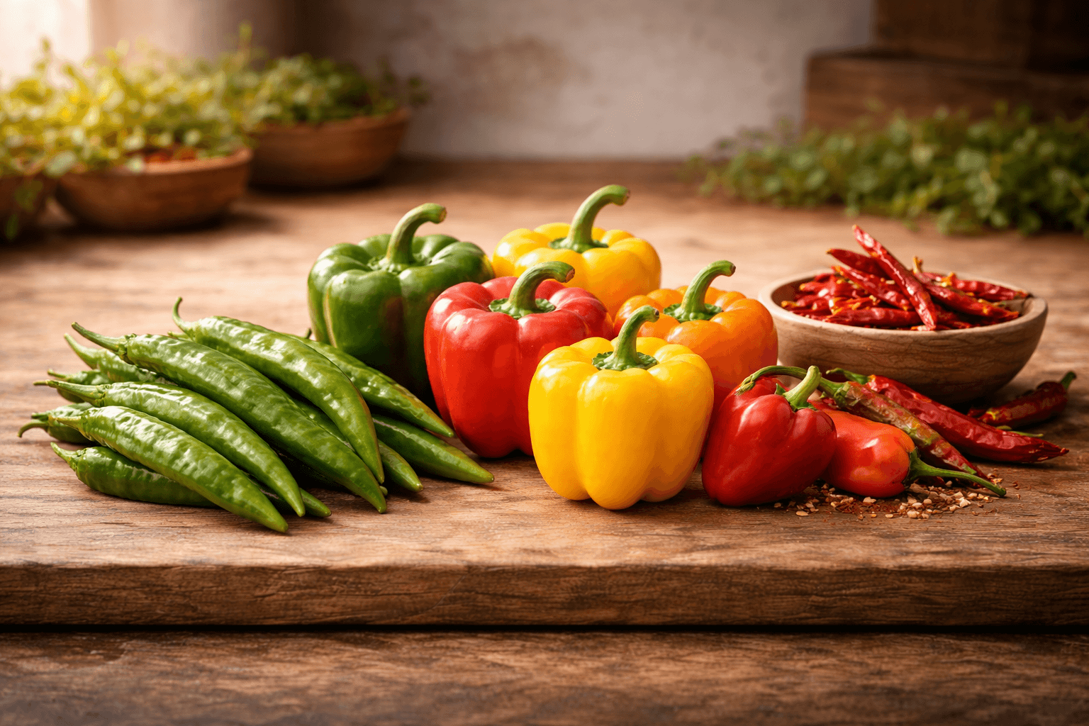세 품종 모두 비타민 C가 풍부하지만 함량에는 차이가 있다. 파프리카는 완숙 상태에서 수확되기 때문에 비타민 C와 베타카로틴 함량이 매우 높다. 특히 빨간 파프리카는 항산화 성분이 풍부해 면역 관리 식단에서 자주 활용된다. 피망도 비타민 C를 함유하고 있으나 파프리카보다는 다소 낮은 편이다. 풋고추는 숙성 전 단계이므로 색소 성분이 충분히 발현되지 않았지만, 캡사이신과 함께 일정량의 비타민 C를 제공한다. 숙성이 진행되어 홍고추가 되면 비타민 A 전구체 성분이 증가한다. 색상 차이는 카로티노이드 색소 발현 정도에 의해 결정되며, 이는 광합성과 숙성 과정과 밀접한 관련이 있다. 세 품종 모두 비타민 C를 풍부하게 함유하고 있지만, 숙성 단계와 색상에 따라 항산화 성분 구성은 달라진다. 파프리카는 완숙 상태에서 수확되기 때문에 카로티노이드 색소가 충분히 발현되어 있으며, 특히 빨간 파프리카는 베타카로틴과 라이코펜 함량이 높다. 이러한 성분은 체내에서 항산화 작용을 하며 세포 손상 완화에 기여할 수 있는 물질로 알려져 있다. 피망 역시 비타민 C를 다량 포함하지만, 일반적으로 완숙 파프리카보다는 색소 농도가 낮다. 풋고추는 숙성 전 단계라 색소 발현은 적지만, 대신 일정량의 캡사이신을 포함해 특유의 기능성을 가진다. 숙성이 진행되어 홍고추가 되면 비타민 A 전구체가 증가하고 항산화 능력도 향상된다. 따라서 색상 변화는 단순한 외형 차이가 아니라, 영양 구성의 변화를 보여주는 생리적 지표라고 할 수 있다.
