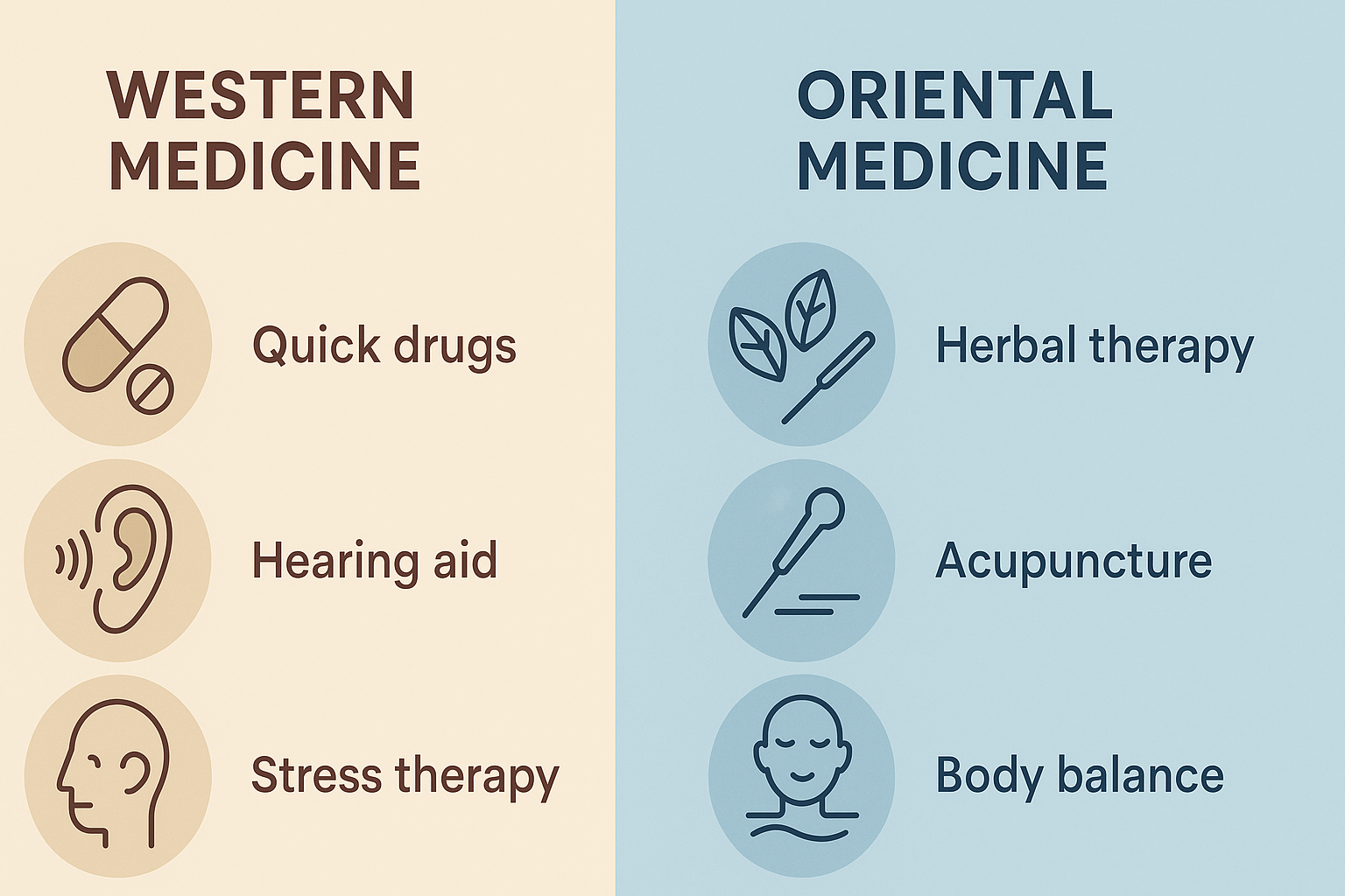 양방 치료는 이명을 하나의 증상으로 보고, 그 원인이 되는 청각기관의 손상 또는 청신경 기능 이상을 찾아내는 데 초점을 둡니다. 특히 돌발성 난청이나 노인성 난청이 동반된 경우에는 이명 역시 청력 저하의 연장선으로 간주되어, 스테로이드 주사, 혈류 개선제, 신경안정제 등이 투여됩니다. 초기일수록 치료 효과가 크며, 혈액순환을 개선하고 청신경 자극을 줄이는 치료가 병행됩니다. 한편, 한방 치료는 이명을 단순히 귀의 문제로 보지 않고, 신체 전반의 순환 장애나 기혈 불균형, 스트레스성 장부 기능 저하로 해석합니다. 따라서 청력을 회복하기 위한 접근보다는 이명을 유발하는 내부 원인을 개선하는 방식에 가깝습니다. 대표적으로 귀와 관련된 신장 기능 강화, 간기울결 해소 등을 위한 한약 처방과 함께 침 치료, 뜸, 약침 요법이 활용됩니다. 즉, 양방은 손상된 청각 기능을 회복하거나 보조하는 데 집중하고, 한방은 전신 상태를 개선해 이명의 원인을 근본적으로 조절하는 접근이라 볼 수 있습니다. 청력이 급격히 떨어졌거나 돌발성 난청이 의심되는 경우에는 양방 치료가 우선적으로 권장되며, 장기적인 체질 개선이나 만성화된 이명 관리에는 한방이 보완적으로 활용될 수 있습니다. 양방에서 이명 치료의 1차 목표는 청각기능 보존입니다. 따라서 돌발성 난청과 함께 이명이 발생한 경우, 최대 72시간 이내 스테로이드 치료를 진행해야 청력 회복 가능성을 높일 수 있습니다. 일부 병원에서는 고막을 통해 직접 약물을 주입하는 고실 내 스테로이드 주입술도 시행하고 있습니다. 이와 함께 MRI, 청력검사, 어지럼 검사 등을 통해 청신경 종양이나 내이 질환을 배제하는 과정도 중요합니다. 한방에서는 이명을 귀 단독 문제가 아닌 심신 전반의 불균형 신호로 이해합니다. 예를 들어 스트레스성 이명은 간기울결로 보고, 순환을 돕는 약재를 사용하며, 허약한 체질의 경우 신장 보강 중심의 처방이 적용됩니다. 또한 뜸, 부항, 약침 요법을 병행해 귀 주변 기혈 순환을 촉진하며 자연 회복력을 강화합니다. 만성 이명일수록 한방적 접근이 체질 개선에 도움이 된다고 평가됩니다.