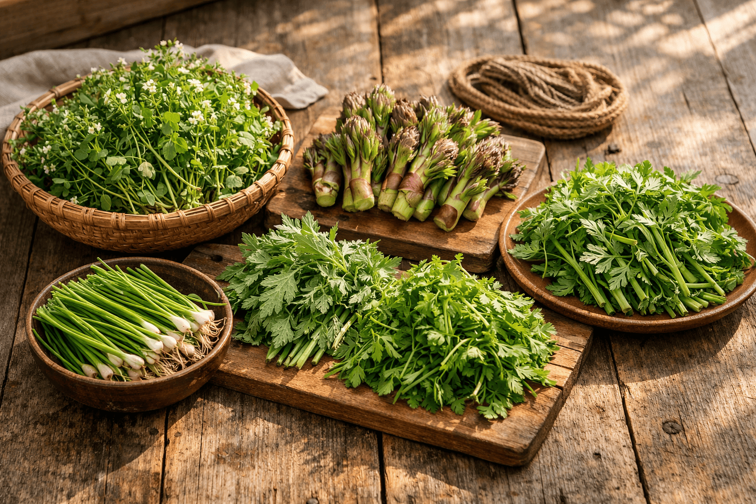 대표적인 봄나물로는 냉이, 달래, 쑥, 두릅, 씀바귀, 돌나물, 방풍나물, 원추리, 취나물, 미나리가 있습니다. 냉이는 단백질과 비타민 A가 풍부하여 눈 건강과 면역력 강화에 효과적이며, 특히 간 기능 개선에 도움을 줍니다. 달래는 알리신 성분이 많아 혈액순환을 촉진하고 피로 회복에 좋습니다. 쑥은 항산화 성분이 뛰어나며 몸을 따뜻하게 해주는 특징이 있어 여성 건강에 특히 유익합니다. 두릅은 사포닌이 풍부해 면역력 증진과 혈당 조절에 도움을 주며, 봄철 대표 보양 식재료로 꼽힙니다. 씀바귀는 쓴맛 성분이 위액 분비를 촉진해 소화를 돕고 입맛을 돋우는 데 효과적입니다. 돌나물은 수분과 비타민 C가 풍부해 피부 건강과 해독 작용에 좋으며, 생으로 섭취하기에 적합합니다. 방풍나물은 이름처럼 풍을 예방하는 효과가 있다고 알려져 있으며, 관절 건강과 항염 작용에 도움을 줍니다. 원추리는 스트레스 완화와 신경 안정에 좋고, 취나물은 칼슘과 철분이 풍부해 뼈 건강에 도움을 줍니다. 마지막으로 미나리는 해독 작용과 간 기능 개선에 탁월하여 봄철 미세먼지와 환경 스트레스 대응 식품으로 주목받고 있습니다. 봄나물의 영양 가치는 단순히 비타민 함량에 그치지 않고, 계절 변화에 적응하는 우리 몸에 꼭 필요한 생리활성 물질을 풍부하게 포함하고 있다는 점에서 더욱 중요합니다. 예를 들어 냉이에 포함된 콜린 성분은 간 해독 작용을 도와 겨울철 축적된 노폐물 배출에 도움을 주며, 달래의 알리신은 항균 작용과 함께 혈중 콜레스테롤 수치를 낮추는 데 긍정적인 영향을 줍니다. 쑥은 플라보노이드와 같은 항산화 성분이 풍부하여 세포 손상을 억제하고 노화 방지에 도움을 줄 수 있습니다. 또한 두릅에 포함된 사포닌은 면역세포 활성화를 유도하여 외부 바이러스나 세균으로부터 몸을 보호하는 역할을 합니다. 이 외에도 봄나물은 식이섬유가 풍부하여 장 건강 개선에 도움을 주며, 변비 예방에도 효과적입니다. 특히 돌나물과 미나리는 수분 함량이 높아 체내 수분 균형을 유지하는 데 유리하며, 봄철 건조한 환경에서 피부 건강을 유지하는 데 도움을 줍니다. 방풍나물과 취나물은 특유의 향 성분이 신경을 안정시키고 스트레스 완화에도 긍정적인 영향을 줄 수 있습니다. 이러한 다양한 영양적 특성 덕분에 봄나물은 단순한 반찬을 넘어 자연이 제공하는 기능성 식품으 로 평가받고 있으며, 규칙적인 섭취를 통해 전반적인 건강 수준을 높이는 데 기여할 수 있습니다.